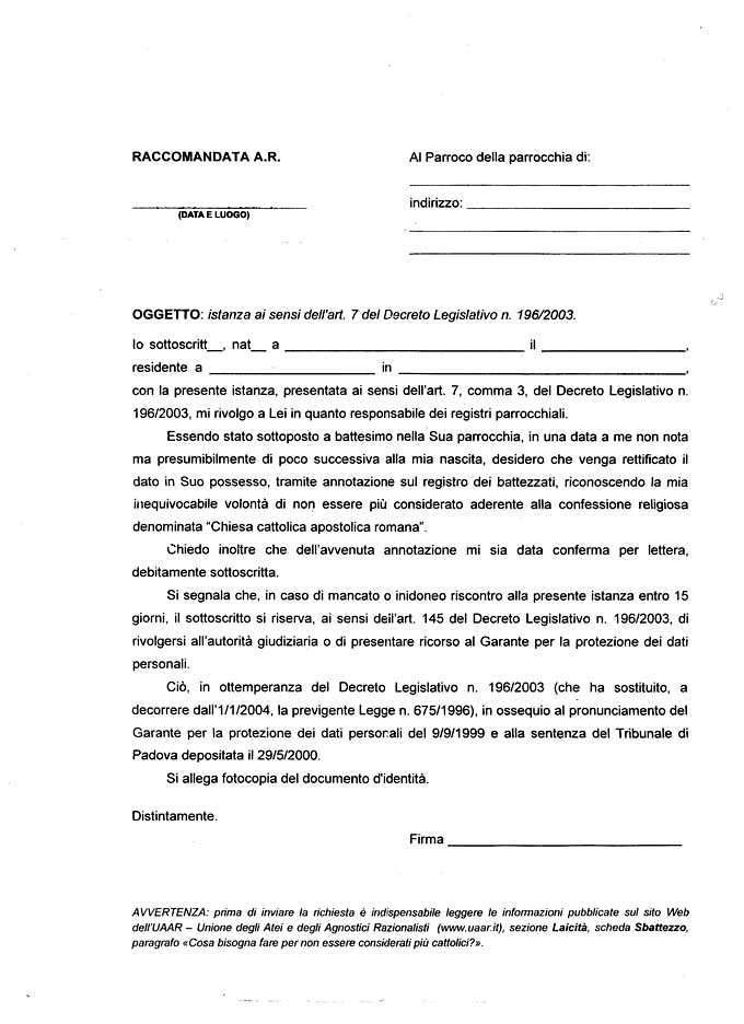 la privacy, di poter abbandonare una confessione religiosa: nel caso